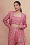 Featuring a pink blazer in brocade base with print, mirror and sequins hand embroidery. It is paired with a crop top and straight-leg pants. Accentuate it with statement earrings and heels for a festive look.