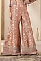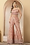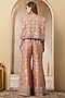 Featuring a rose gold short jacket in jacquard silk base with embroidery. It is paired with a sleeveless cropped blouse and high-waisted flared pants. Accentuate it with statement jewellery and metallic heels for an opulent look, perfect for sangeet, receptions and glamorous festive celebrations.