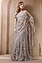 Featuring a silver pre-draped gown saree in net base with bead work, cutdana and sequin hand embroidery. It is paired with an embroidered blouse. Accentuate it with silver jewellery and heels for festive celebrations or wedding functions.