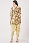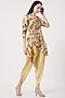 Featuring a yellow peplum top in silk base with print. It is paired with matching harem pants.