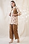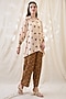 Featuring a beige kurta in cotton silk base with embroidery. It is paired with pants and a malaysian silk jacket. Accentuate it with statement earrings and flats for a casual wear.