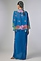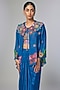 Featuring a blue cape in organza base with embroidery. It is paired with a printed top and a crepe draped skirt. Style it with statement earrings and heels, perfect for a festive occasion, cocktail or sangeet ceremony.