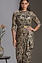 Featuring a green and black draped dress in sequins base with print and a golden belt.