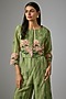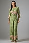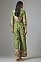 Featuring a green jumpsuit in linen cotton base with hand and machine embroidery, including digital print. It is paired with a jacket. Accentuate it with statement earrings and heels for evening soirees.
