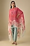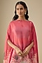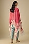 Featuring a pink cape in organza base with floral print. It is paired with a bustier and blue chanderi pants. Accentuate it with dangler earrings and heels for festive occasions, cocktail or sangeet ceremonies.