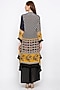 Featuring a navy blue wrap kurta in crepe base with yellow print and fringe lacing. It is paired with matching black pants.