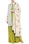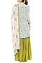 Featuring an olive green sharara style jumpsuit in cotton silk base. It is paired with a matching blue printed jacket and baby pink dupatta.