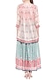 Featuring a pink & blue maxi dress in silk base with print. It is paired with matching asymmetrical jacket.