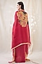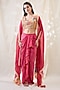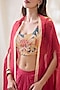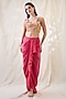 Featuring a pink bustier in cotton silk base with embellishments. It is paired with a crepe draped skirt and an organza long cape. Accentuate it with statement earrings and flats for a casual wear.