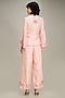 Soup by Sougat Paul features a Pink Co-Ord Set that captivates with its elegance. The eye-catching overlapped top is crafted in chanderi with applique embroidery. It is paired with an inner and linen flared pants. Style this co-ord set with minimal jewellery and heels for a complete look, showcasing style and sophistication.