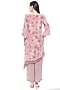 Featuring a pink asymmetric top in crepe base with green and off white floral print along gold embroidery. It is paired with matching palazzo pants.