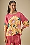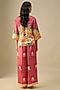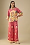 Featuring a pink top in satin base with floral print. It is paired with pants. Accentuate it with dangler earrings and heels for festive occasions, haldi or sangeet ceremonies.