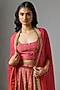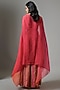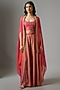 Featuring a pink cape in silk and organza base with digital print. It is paired with bustier and printed palazzo pants. Accentuate it with dangler earrings and heels for festive celebrations or sangeet ceremony.