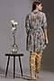 Featuring a powder blue and yellow narrow bottom jumpsuit in satin and organza base with print. It is paired with a matching jacket having a chiffon collar and ruched sleeves.