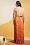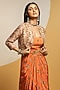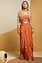 Featuring a rust draped dress in crepe base with print. It is paired with a beige silk embroidered jacket. Style it with stud earrings, heels and soft curls for a classy look. Ideal for a cocktail party.