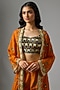 Featuring a rust cape in silk and organza base with digital print. It is paired with bustier and printed sharara pants. Accentuate it with dangler earrings and heels for festive celebrations or sangeet ceremony.