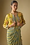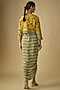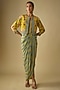 Featuring a yellow draped dress in crepe base with print. It is paired with a velvet embroidered short jacket. Accentuate it dangler earrings and block heels for daytime functions or resort parties.