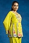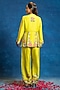 Featuring a yellow top in malaysian silk base with embellishment. It is paired with printed straight pants. Accentuate it with stud earrings and wedges for a festive look.