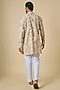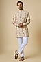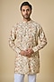 Featuring a beige kurta for boys in blended silk base with floral print. It is paired with white cotton pants. Style it with kolhapuri sandals and a watch for festive occasions, pooja or cultural celebrations.