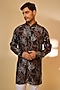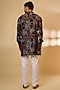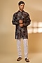 Featuring a black kurta for boys in cotton linen base with tropical print and gold detailing. It is paired with white cotton pants. Style it with a watch and a pair of kolhapuri sandals for a festive occasion or sangeet ceremony.