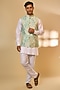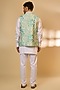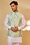 Featuring a blue nehru jacket for boys in blended silk base with botanical print. It is paired with a white cotton satin kurta and white cotton pants. Style it with a watch and a pair of kolhapuris for a festive occasion or pooja ceremony.