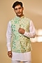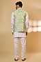 Featuring a green nehru jacket for boys in blended silk base with botanical print. It is paired with a white cotton satin kurta and white cotton pants. Style it with a watch and a pair of kolhapuris for a festive occasion or pooja ceremony.