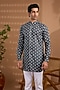 Featuring a grey shirt-style kurta for boys in cotton base with ikat print. Style it with pants and mojaris for a festive occasion, cultural event or pooja ceremony.