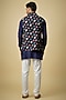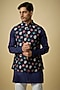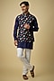 Featuring a navy blue nehru jacket for boys in blended silk base with leaf print. It is paired with a cotton satin kurta and white cotton pants. Style it with kolhapuri sandals and a watch for a festive occasion, wedding or mehendi ceremony.