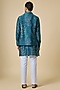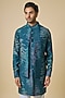 Featuring a blue jacket in blended silk base with botanical print. It is paired with a shirt-style kurta and white cotton pants. Style it with kolhapuri sandals for a festive occasion, wedding or engagement ceremony.