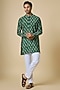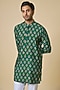 Featuring a green kurta in blended silk base with botanical print. It is paired with white cotton pants. Style it with kolhapuri sandals for a festive occasion, mehendi or an intimate pooja ceremony.