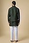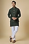 Featuring a bottle green bundi jacket in blended silk base with embroidery. It is paired with a cotton satin kurta and white cotton pants. Style it with kolhapuri sandals for a festive occasion, mehendi or engagement ceremony.