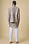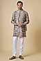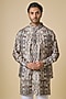 Featuring a grey jacket in blended silk base with ikat digital print. It is paired with a kurta and white cotton pants. Style it with kolhapuri sandals for a festive occasion, wedding or engagement ceremony.