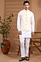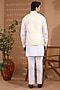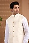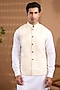 Featuring an ivory bundi jacket in blended silk base with embroidery. It is paired with a cotton satin kurta and pants. Style it with mojaris for a wedding, sangeet or engagement ceremony.