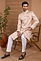 Featuring a light pink sherwani in blended silk base with embroidery. It is paired with cotton satin pants. Style it with mojaris for a wedding or engagement ceremony.