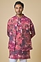 Featuring a pink jacket in blended silk base with floral print. It is paired with a kurta and white cotton pants. Style it with kolhapuri sandals for a festive occasion, wedding or engagement ceremony.