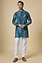 Featuring a teal kurta in blended silk base with floral print. It is paired with white cotton pants. Style it with kolhapuri sandals for a festive occasion, mehendi or an intimate pooja ceremony.