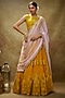 Featuring a haldi yellow lehenga for girls in soft net base with sequins and thread embroidery, including a can-can. It is paired with a blouse having cap sleeves and a sweetheart neckline, including a rose pink dupatta. Style it with sandals, a sling bag and an embellished hairband, ideal for any festive occasion.