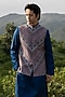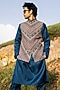 Featuring a blue bundi jacket in silk base with machine embroidery. It is paired with a kurta and pants. Style it with a pair of loafers and a bracelet for a wedding or sangeet ceremony.