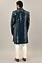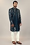 Featuring a dark teal indowestern in viscose silk base with foil mirror embroidery. It is paired with a jacquard silk kurta and pants. Perfect wear for pre-wedding ceremonies.