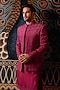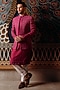 Featuring a magenta indo-western jacket in silk base with embroidery. It is paired with a matching kurta and contrasting off-white cotton trousers. .
