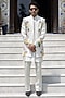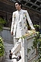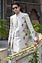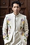 Featuring a mint indowestern in raw silk base with hand paint and hand embroidery. It is paired with a kurta and pants. Style it with a pair of loafers and a bracelet for a wedding or sangeet ceremony.