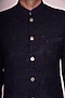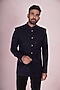 Featuring a navy blue bandhgala jacket in velvet base with thread embroidery. It is paired with contrasting black cotton trousers.