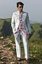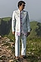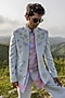 Featuring a sky blue indowestern in raw silk base with hand embroidery. It is paired with a printed kurta and pants. Style it with a pair of loafers and a bracelet for an engagement or carnival ceremony.