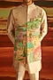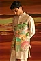 Featuring a white indowestern jacket in raw silk base with hand painting and hand embroidery. It is paired with a kurta and pants. Style it with a safa and pair of mojaris for a traditional look, Perfect attire for your wedding, engagement or sangeet ceremony.