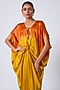 Featuring a gold leheriya dress in silk lyca satin base with a front knot. Accentuate it with dangler earrings and heels for a festive ready look.