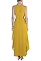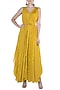 Featuring a mustard layered gown in jacquard, georgette and silk crepe base with deep v-neck, floral print and belt.