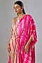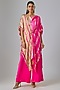 Featuring a pink leheriya tunic in silk lycra satin base with a high neck and back tie-up detail. It is paired with silk crepe trousers. Accentuate it with statement earrings and heels for a festive vibe.