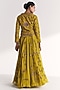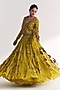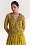 Featuring a lime green lehenga in raw silk and organza base with embroidery. It is paired with a bustier and a hand embroidered jacket. Accentuate it with kundan polki jewellery and embellished heels for weddings or mehendi ceremony.