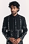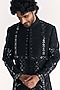 Featuring a black achkan in raw silk base with handwork. It is paired with chanderi pants. Style it up with a stole, mojaris and malas for a wedding or engagement ceremony.