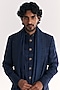 Featuring a blue achkan in raw silk base with handwork. It is paired with chanderi pants and a stole. Style it up with mojaris and malas for a wedding, sangeet or engagement ceremony.